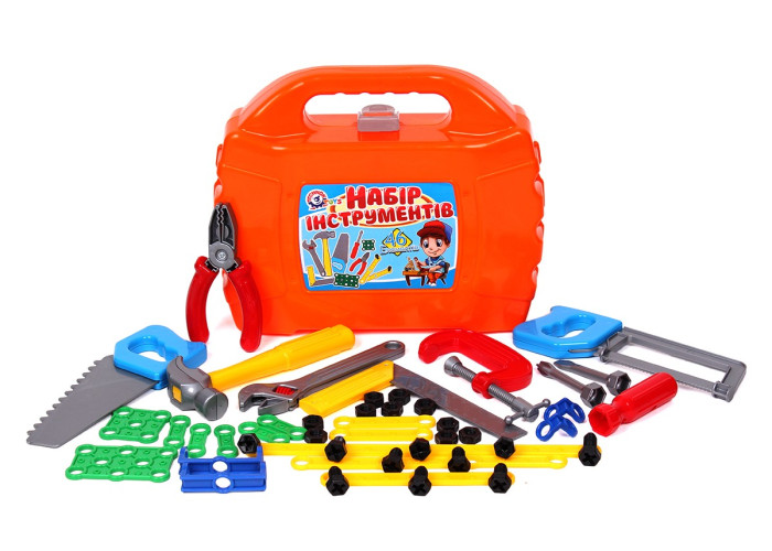 Іграшка доповнює класичний набір інструментів з набору (молоток, пилочки, викрутки, плоскогубці та ін.) елементами конструктора, а саме: пластикові планки, кутники, пластини, болти та гайки. Це чудова нагода для малюка вивчити принципи роботи різьбових з єднань, що безумовно стане в нагоді у дорослому житті. В комплекті: плоскогубці, кутник, молоток, пилка по металу, пилка по дереву, струбцина, розвідний ключ, викрутка з двома насадками, болти та гайки по 10 шт., планки - 10 шт., пластини - 10 шт., кутники - 2 шт. та 2-і скоби.