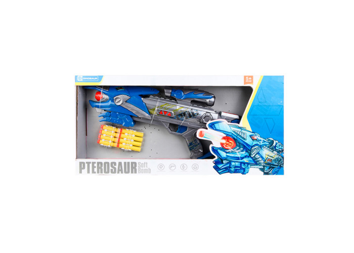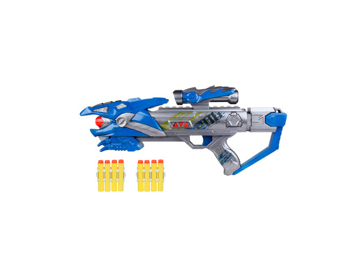 Рушниця - це футуристичний бластер для битв людей проти динозаврів. Корпус забарвлений в синій колір з жовтими вставками. Автомат стріляє з одиночного пострілу, м'якими патронами з пластиковими наконечниками. Головна особливість зброї - світлозвукові ефекти. Ефекти моделі при натисканні на курок: - реалістичні звуки; - підсвічування очей - червоним кольором. Конструкція включає в себе - оптичний приціл, зручну рукоять, ударний механізм, приклад і спеціальний утримувач для патронів. Він знаходиться на прикладі і вміщує в себе 6 снарядів. Ефекти активуються за допомогою спеціального перемикача, який знаходиться на стовбурі автомата. Комплектація: - автомат; - 10 м'яких патронів. Ефекти працюють від 3-х батарейок АА на 1.5 V - не додаються. Вік: 5+ Рушниця - 49 см. У коробці 53х25х8см.