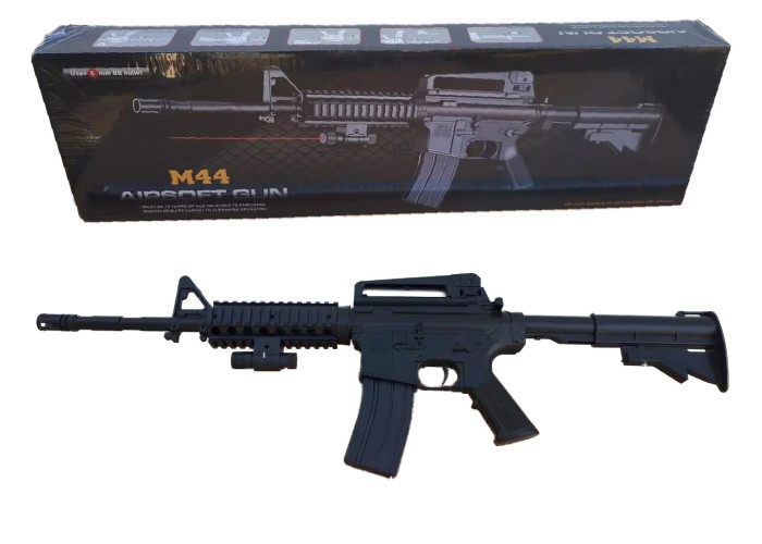 Іграшковий автомат, кульки, лазер. Автомат M44 імітує реальну вогнепальну зброю. Пластиковий корпус має високу деталізацію і точно передає конструктивні особливості автомата. Потужний ударно-пружинний механізм вистрілює пластиковими кулями з діаметром 6 мм. Додатково автомат оснащений лазерним прицілом. Автомат призначений для стрілянини по мішенях. Дотримуйтесь техніки безпеки, не стріляйте в людей і тварин!
