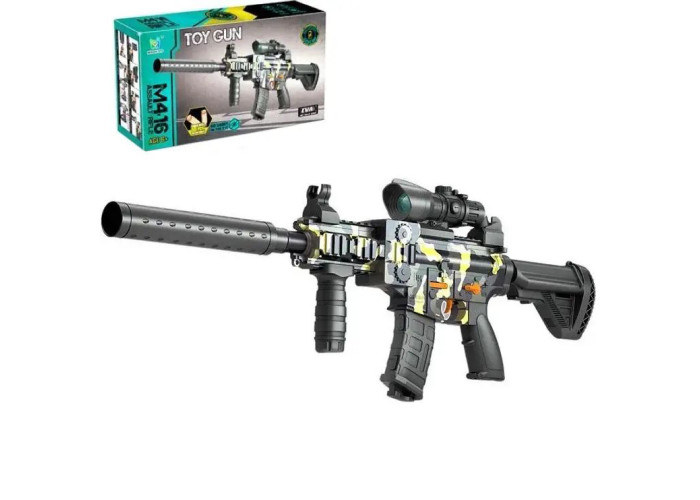 Автомат – це реалістична моделька справжньої зброї. З такою ігровою моделлю дитині буде цікаво розігрувати тематичні сюжети разом зі своїми сміливими напарниками. Зброя виготовлена з первинної пластмаси, що здатна витримувати фізичні ушкодження та має високу зносостійкість. Щоб привести в дію автомат, зберіть конструкцію, вставте батарейки та зарядіть магазин м"якими кулями. Увага! Відсік для батарейок знаходиться в прикладі! Особливості: - відмінна деталізація та максимальна реалістичність; - модель виконана у сучасному мілітарі дизайні; - легко розбірна конструкція; - працює від 3х батарейок типу "АА" (у комплект не входять); - знімний оптичний приціл; - 10 м'яких патронів на присосках; - знімний глушник та шомпол для "прочистки ствола".