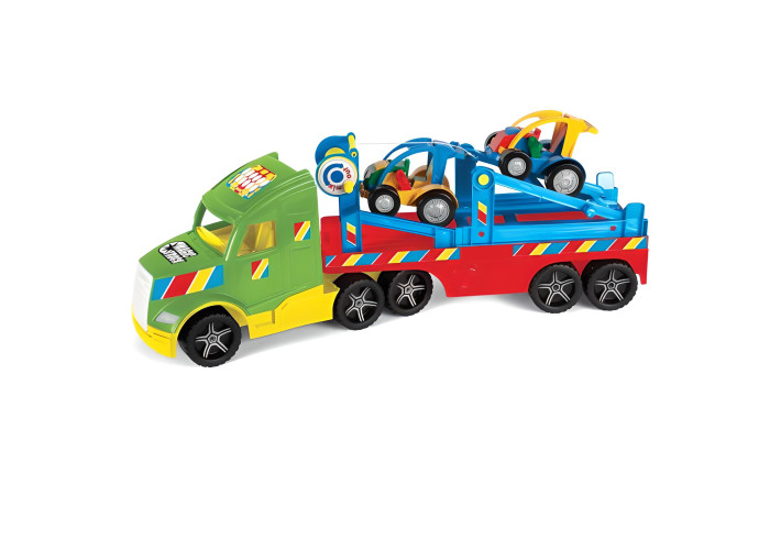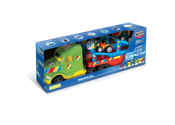 Велика міцна вантажівка розроблена для дітей від 3х років. Її рухомі елементи створюють багато можливостей для ігор. Magic Truck з авто-багі складається з кабіни і рухомого напівпричепа, який призначений для перевезення 2-х машинок, що йдуть у наборі, оснащена пандусами та лебідкою, завдяки яким машинки потрапляють на евакуатор. Напівпричіп можна прикріпити до кабіни двома способами, завдяки чому автомобіль може досягати довжини 110 см. Причіп має додаткові підпірні ніжки, завдяки чому може використовуватись самостійно. Авто має нову удосконалену кабіну з флуоресцентними фарами, що світяться у темряві, колеса оздоблені тамподруком. Всі елементи іграшки виконані з високоякісного безпечного матеріалу. Основною характеристикою машини є її міцність завдяки чому вона може служити дитині протягом багатьох років. Іграшка упакована у гарну коробку, ідеальну для подарунку.