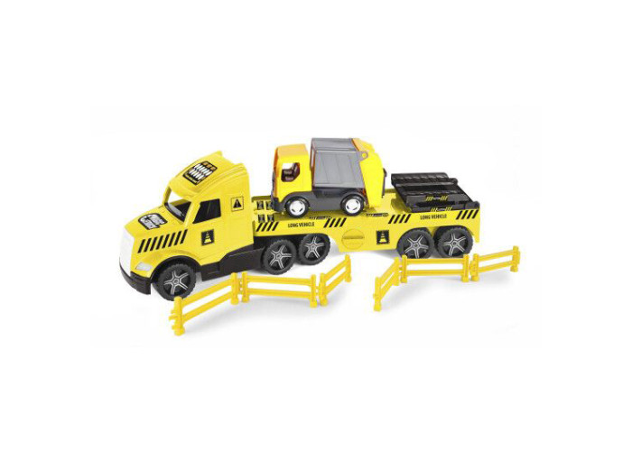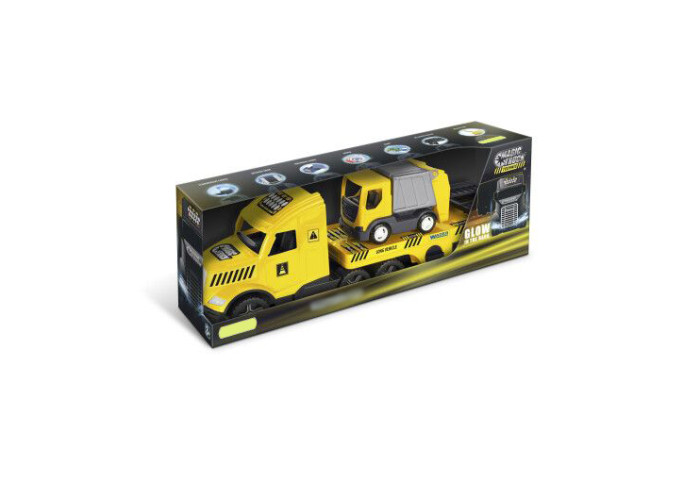 Вантажівка і причіп з’єднуються за допомогою одного кріплення, завдяки чому транспортний засіб, незважаючи на великі габарити, дуже маневрений і легкий у керуванні. Причіп має розкладний пандус по якому піднімається сміттєвіз. Також він обладнаний розкладними підпірними ніжками, завдяки чому його можна використовувати окремо від тягача. На евакуаторі знаходиться сміттєвіз із серії Tech Truck із контейнером для сміття. У нього відкритий задній борт і рухомий підйомник, який допомагає очистити контейнер. До комплекту додані елементи огорожі, якими малий будівельник може огородити будмайданчик. Ігри транспортними засобами з серії Magic Truck Technic стимулюють розвиток дитини, розвивають її мануальні здібності, рухово-зорову координацію. Іграшкою можна гратись як самостійно так і колективно, що додатково сприятиме навчанню організації, обміну, співробітництва і комунікації. Всі елементи виготовлені з високоякісних, міцних і стійких до погодних умов матеріалів, завдяки чому іграшка чудово розважить дитину як вдома так і на пляжі чи у пісочниці. Все упаковано в гарну коробку, ідеальну на подарунок.