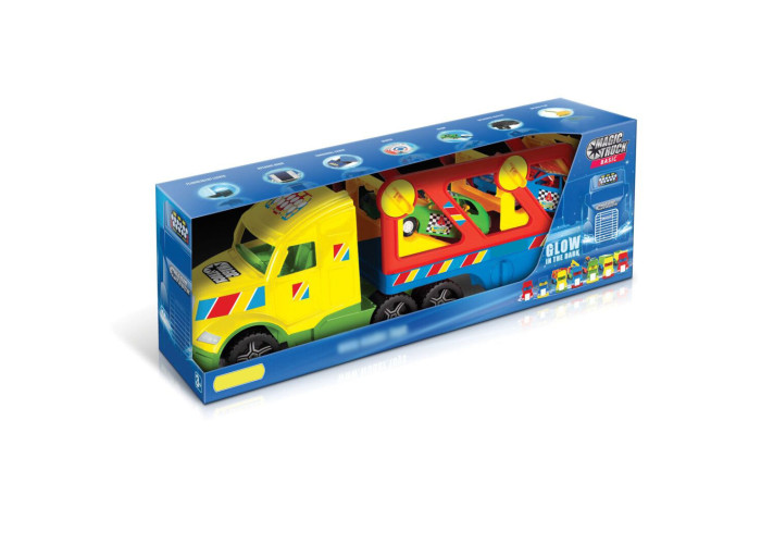 Велика міцна іграшкова вантажівка розроблена для дітей від 3х років. Її рухомі елементи створюють багато можливостей для ігор. Magic Truck з авто-купе складається з кабіни і рухомого напівпричепа, який призначений для перевезення 2-х машинок, що йдуть у наборі, оснащена пандусами та лебідкою, завдяки яким машинки потрапляють на евакуатор. Напівпричіп можна прикріпити до кабіни двома способами, завдяки чому автомобіль може досягати довжини 110 см. Причіп має додаткові підпірні ніжки, завдяки чому може використовуватись самостійно. Авто має нову удосконалену кабіну з флуоресцентними фарами, що світяться у темряві, колеса оздоблені тамподруком. Всі елементи іграшки виконані з високоякісного безпечного матеріалу. Основною характеристикою машини є її міцність завдяки чому вона може служити дитині протягом багатьох років. Іграшка упакована у гарну коробку, ідеальну для подарунку.