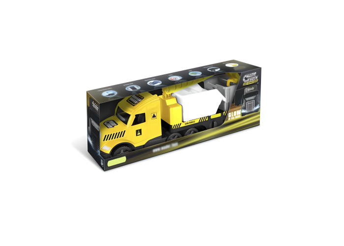 Пориньте у світ магічних вантажівок, що світяться у темряві! Іграшкова вантажівка "Magic Truck Technic" із будівельними контейнерами - це евакуатор з відкритою вантажною платформою з міцною конструкцією, реалістичним, сучасним дизайном та цікавими кольорами. Ця іграшка сподобається всім автолюбителям і шанувальникам будівельної техніки. Авто має нову удосконалену кабіну з флуоресцентними фарами, що світяться у темряві, колеса оздоблені тамподруком.