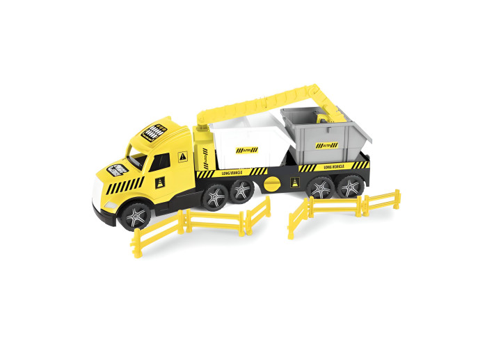 Вантажівка і причіп з’єднуються за допомогою одного кріплення, завдяки чому транспортний засіб, незважаючи на великі габарити, дуже маневрений і легкий у керуванні. На причепі розміщені 2 будівельних контейнера, в які дитина може покласти інші іграшки і безпечно транспортувати їх, наприклад на будівельний майданчик. Причіп з краном, що може підіймати і опускати контейнери, може кріпитись до тягача 2 способами. Також він обладнаний розкладними підпірними ніжками, завдяки чому його можна використовувати окремо від тягача. До комплекту додані елементи огорожі, якими малий будівельник може огородити будмайданчик. Ігри транспортними засобами з серії Magic Truck Technic стимулюють розвиток дитини, розвивають її мануальні здібності, рухово-зорову координацію. Іграшкою можна гратись як самостійно так і колективно, що додатково сприятиме навчанню організації, обміну, співробітництва і комунікації. Всі елементи виготовлені з високоякісних, міцних і стійких до погодних умов матеріалів, завдяки чому іграшка чудово розважить дитину як вдома так і на пляжі чи у пісочниці. Все упаковано в гарну коробку, ідеальну на подарунок.