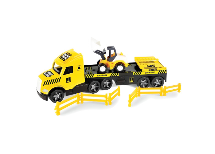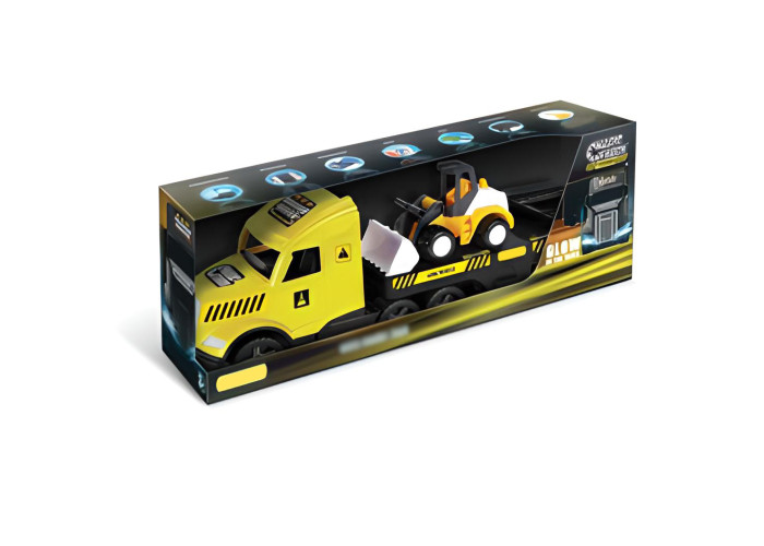 Вантажівка і причіп з’єднуються за допомогою одного кріплення, завдяки чому транспортний засіб, незважаючи на великі габарити, дуже маневрений і легкий у керуванні. Причіп має розкладний пандус по якому піднімається бульдозер. Також він обладнаний розкладними підпірними ніжками, завдяки чому його можна використовувати окремо від тягача. На евакуаторі знаходиться бульдозер з серії Tech Truck з рухомим ковшем, за допомогою якого малюк може завантажувати і перевозити будівельні матеріали чи будь що інше. До комплекту додані елементи огорожі, якими малий будівельник може огородити будмайданчик. Ігри транспортними засобами з серії Magic Truck Technic стимулюють розвиток дитини, розвивають її мануальні здібності, рухово-зорову координацію. Іграшкою можна гратись як самостійно так і колективно, що додатково сприятиме навчанню організації, обміну, співробітництва і комунікації. Всі елементи виготовлені з високоякісних, міцних і стійких до погодних умов матеріалів, завдяки чому іграшка чудово розважить дитину як вдома так і на пляжі чи у пісочниці. Все упаковано в гарну коробку, ідеальну на подарунок.
