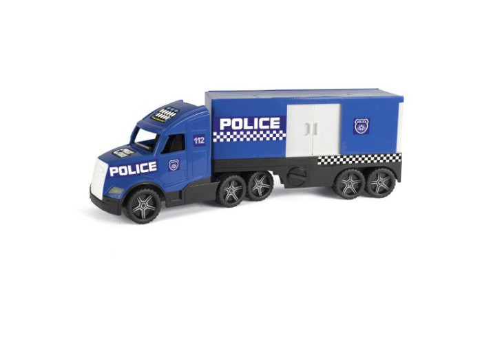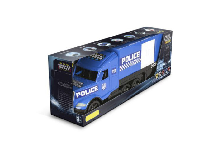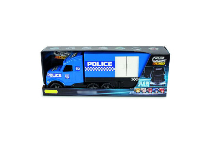 Magic Truck - Поліція біло-синього кольору має великий фургон, який можна чіпляти до кабіни 2 способами. Вантажівка має нову удосконалену кабіну з фарами, що світяться у темряві, колеса оздоблені тамподруком, а також багато рухомих елементів. У фургоні є розсувні бокові двері, а також задні двері, що відкриваються, завдяки чому можна туди завантажувати різні предмети. У причепа є висувні підпірні ніжки, які дозволяють використовувати його самостійно. Всі елементи іграшки виконані з високоякісного безпечного матеріалу. Основною характеристикою машини є її міцність завдяки чому вона може служити дитині протягом багатьох років. Іграшка упакована у гарну коробку, ідеальну для подарунку.