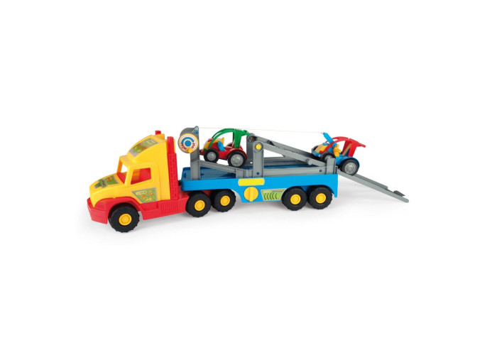 Евакуатор обладнаний системою завантаження / розвантаження автомобілів, а також висувною направляючою. У комплект входять також дві іграшкові машинки авто-баггі.