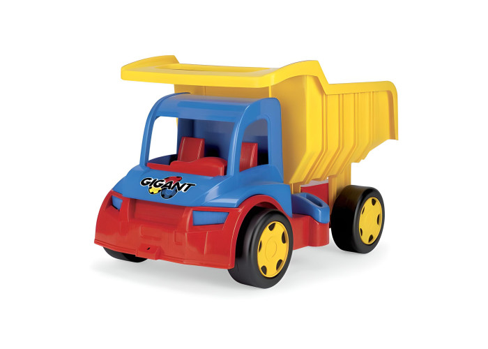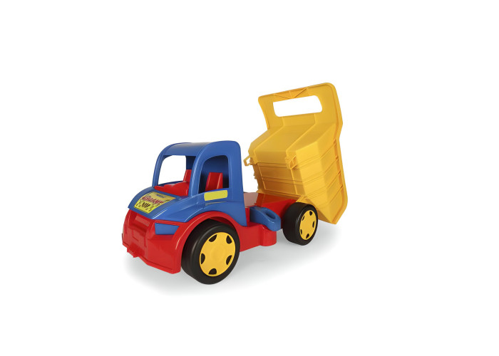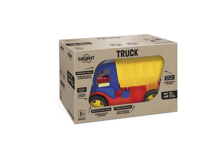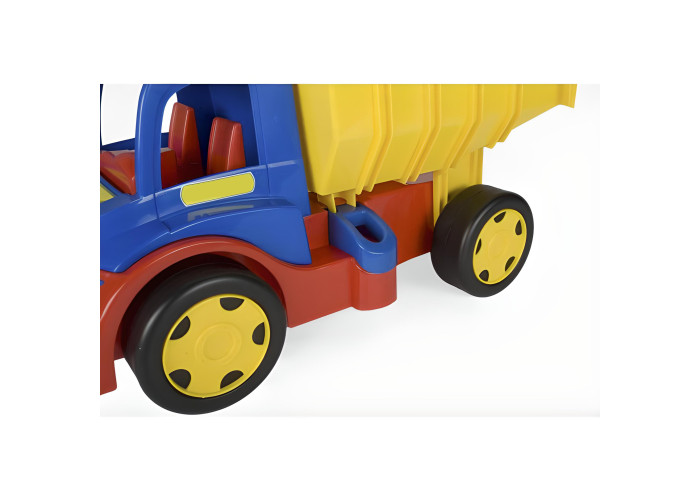 Іграшкова вантажівка "Гігант" - надзвичайно великий автомобіль довжиною 55 см. Машинка спереду має отвір для кріплення мотузки, шнурка тощо, за допомогою яких дитина може її тягнути. А також є можливість ззаду вчепити причеп. Вантажівка має відкритий кузов, який можна відкинути назад, а положення кузова фіксується спеціальним фіксатором. Діти будуть у захваті від процесу завантаження, розвантаження і перевезення улюблених іграшок, а також від їзди по дому і саду. Найменші можуть самостійно їздити, сидячи в кузові автомобіля і відштовхуючись ніжками. Величезна вантажопідйомність (до 150 кг) гарантує дитині цікаву гру як на одинці, так і у компанії друзів чи батьків. Велика, міцна і багатофункціональна машина обов’язково сподобається маленьким автолюбителям і вона служитиме їм роками. Ігри вантажівкою гігантом розвивають уяву найменших дітей, підтримує їх мануальні здібності і рухову координацію дитини, а різнокольорові елементи допоможуть у вивчені кольорів. Всі елементи виготовлені з високоякісних безпечних матеріалів для дітей. Іграшка упакована в гарну картонну коробку, ідеальну на подарунок.