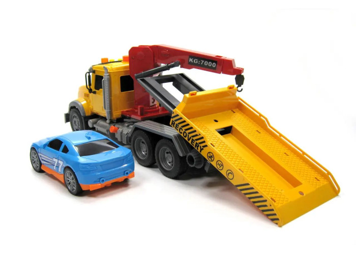 Прекрасним подарунком для любителів машин стане барвистий евакуатор із рухомими елементами від торгової марки Автопром. Іграшковий автовоз-евакуатор зі зсувним майданчиком і краном-маніпулятором для навантаження-вивантаження транспорту. Дитина зможе відчути себе водієм справжнього автотранспортера, на якому можна керувати підйомним механізмом. Також у комплекті йде окремий легковий автомобіль. Усі деталі відповідають високим стандартам якості та безпеки, використовується гіпоалергенна пластмаса. Колеса транспортера мають реверсивну течію. Потужний інерційний механізм на передніх колесах.