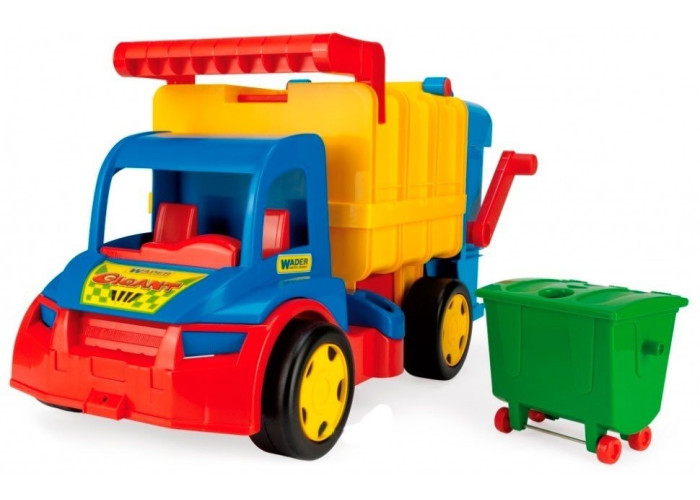 Авто серії Wader Gіgant Truck - справжні гіганти, дитина може не тільки возити машину, а і їздити на ній! Сміттєвоз Гігант витримує до 50 кг.ваги! Сміттєвоз Гігант створений з міцного різнокольорового пластику, оснащений сміттєвим контейнером, рухливим кузовом, що дозволяє спустошувати контейнер, і заднім клапаном, що відкривається, для навантаження об'єктів. Дитина може сідати на сміттєвоз і відштовхуватися ногами, тримаючись за спеціальну рукоятку. Довжина машини 65 см. Машина представлена у картонній упаковці.