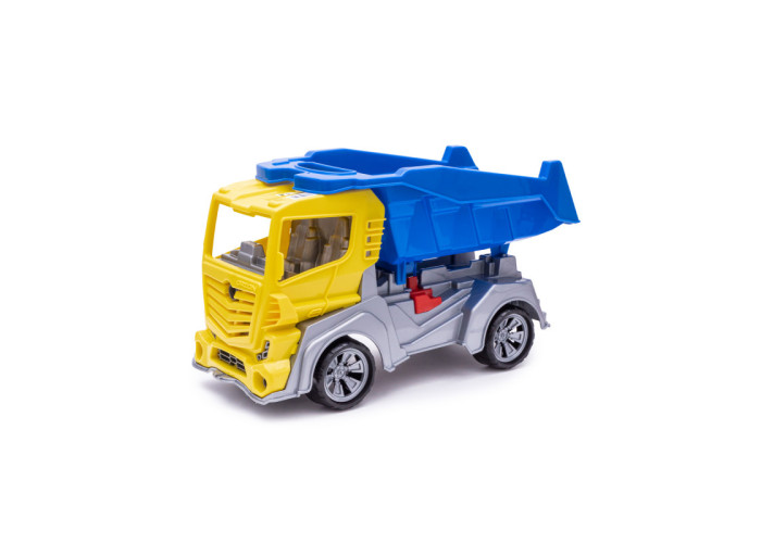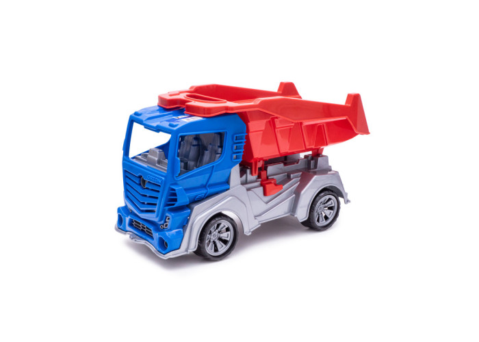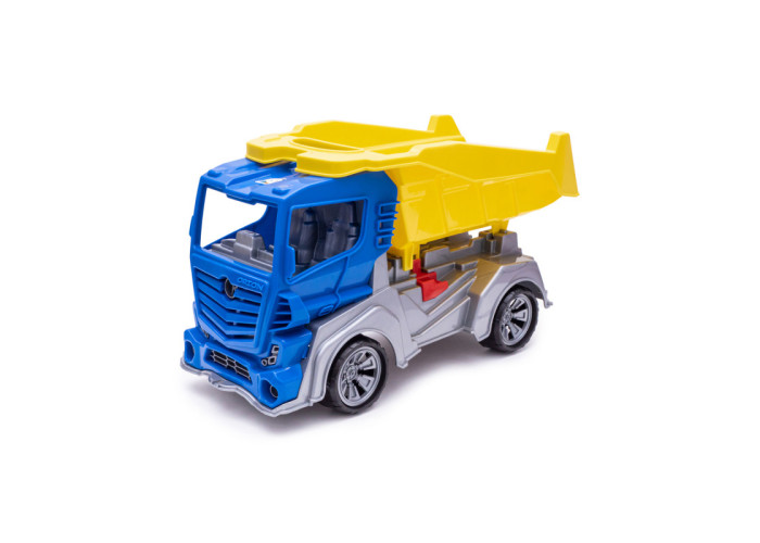 Дана модель іграшки виготовляється на основі двухосного шасі з двома сидіннями. Іграшка має 4 колеса на 2-х осях, які встановлюються на кронштейни шасі. Колеса мають декоративні ковпаки. На шасі встановлюється кабіна. Кабіна з двох сторін має дзеркала заднього виду, спереду - бампер у вигляді ребристої поверхні, отвори для двох фар шасі. На шасі встановлюється кузов самоскида, який можна зупинити фіксатором встановленим в середній частині шасі. Всі деталі виготовляються методом лиття під тиском з поліпропілену.