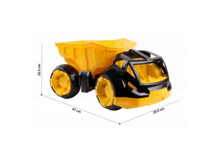 Варто відзначити універсальність іграшки: завдяки боковому вивантаженню самоскид можна використовувати на обмежених площадках, а потужні колеса, виготовлені методом видмуху, забезпечують йому високу прохідність. До речі, хід у самоскида дуже й дуже тихий.