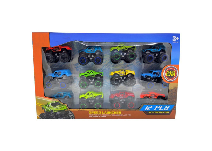 Тематичний набір з 12 машинок Monster Truck у масштабі 1:64 з велетенськими колесами та дивовижним дизайном, що робить аварії та зіткнення епічними. Дивовижний набір металевих моделей машинок який зробить гру ними різноманітними і кожного дня незабутніми, кожна машинка відрізняється одна від одної має свій унікальний дизайн і свою унікальні історію. Чудовий подарунок для дітей віком від 3 до 6 років. Кожна машинка виготовлена з металу, на гумових колесах та пофарбована якісними і не токсичними фарбами які не шкодять здоров'ю та міцно триматиметься під час найрізноманітниших "краш-тестів" малюка.