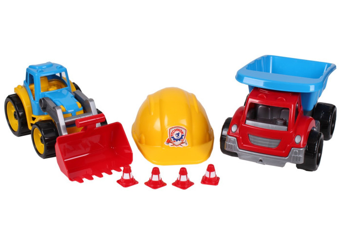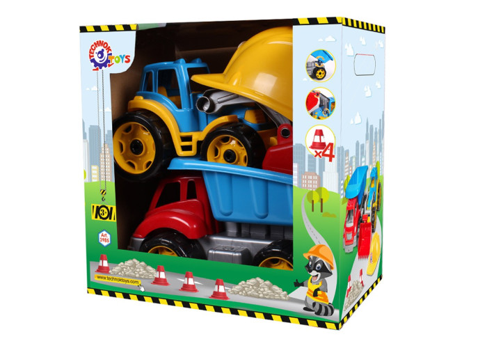Іграшка «Малюк-будівельник 2 ТехноК» - чудовий подарунок для малюка, який мріє збудувати країну щасливих людей, що будуть жити в сонячних містах та їздити по чудових дорогах. До комплекту входять самоскид, трактор з ковшем, 4 двоколірні дорожні конуси та будівельна каска. Яскрава напіввідкрита коробка дозволяє побачити іграшку і робить її водночас бажаним подарунком.