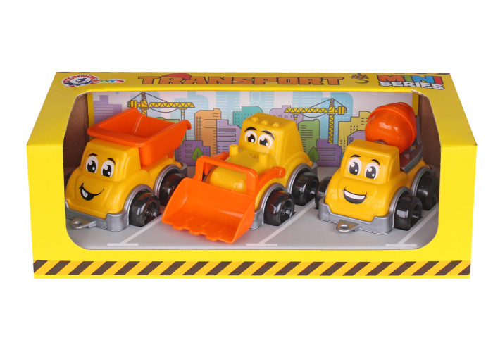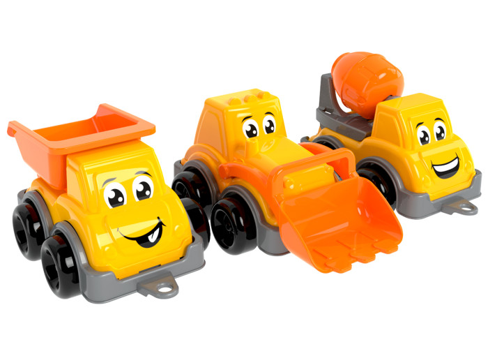 У наборі маленькі самоскид, трактор та автоміксер. З іграшками цікаво гратися у пісочниці та вдома. Можна будувати дороги, мости та будинки, перевозити вантажі, змішувати бетон чи копати траншеї. Такі ігри розвивають у малюків фантазію, уяву та мислення.