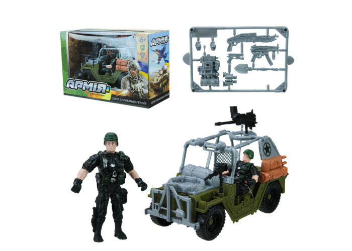 Набір, до якого входить військовий джип, фігурка військового, та комплект зброї для нього. У фігурки рухливі руки, ноги та голова, військового можна посадити в кабіну джипа. Набір добре деталізований, виконаний із міцного пластику. Розмір джипа: 19х10х7 см.