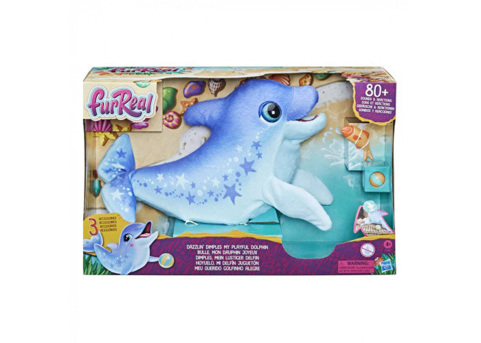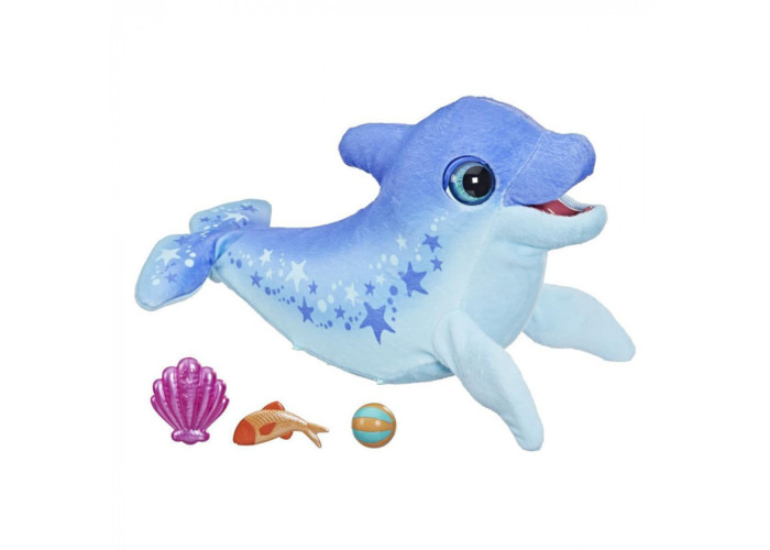 Чарівна іграшка FurReal Friends Грайливий Дельфін стане кращим другом для вашого малюка. Ця інтерактивна іграшка може продемонструвати більше 80 звуків і реакцій! Дитина із задоволенням доглядатиме за своїм вихованцем, годуватиме його смачною рибкою і чистити його м'які боки щіткою. На ніжне погладжування дельфін відповість рухом хвоста, але це ще не усе, на що він здатний! Якщо підштовхнути в його сторону м'ячик, то він спробує відбити його назад. Ще діти можуть уявити, що дельфін пливе по хвилях, і тоді під звуки океану він продемонструє усе своє уміння плавати і пірнати. А якщо обійняти дельфіна і поцілувати його в ніс, то він засяє від задоволення!