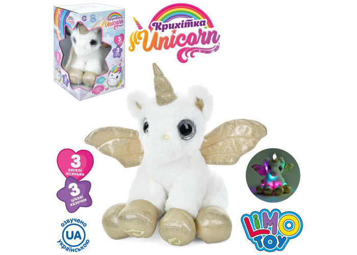 Це симпатична м'яка іграшка єдиноріг з інтерактивними функціями. По-перше, іграшка озвучена українською мовою і може розповісти казки - 3 штучки і навіть заспівати пісеньки. По-друге, іграшка послужить чудовим нічником або компаньйоном для ігор у темну пору доби, т.к. Інгушка має режим підсвічування різнобарвними вогниками.