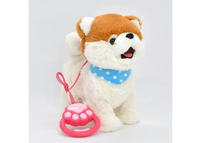 Пухнастий песик керується за допомогою повідця - пульта, реагує на дотики і на хлопки.