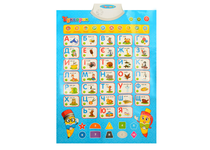 Плакат має регулювання гучності, сенсорні кнопки та вологостійку поверхню. Іграшку можна покласти на стіл або повісити на стіну.