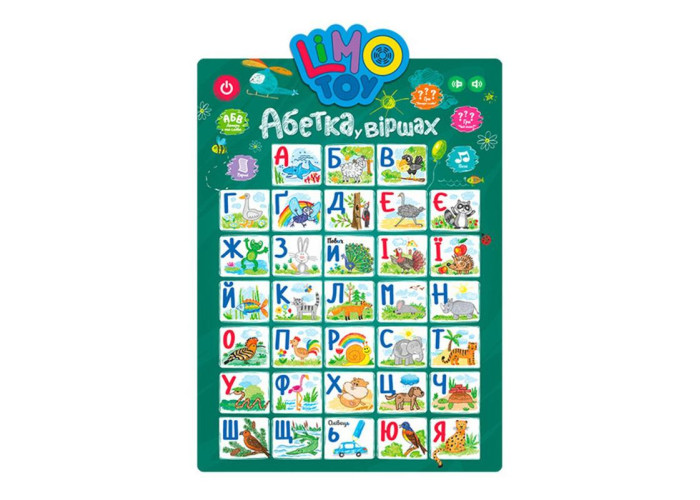 Сенсорний звуковий плакат SK 0021 від виробника Limo Toy спрямований на різнобічний розвиток дитини. Плакат зручний в управлінні, так що дитина може самостійно навчатися і отримувати нові знання. Інтерактивний плакат допоможе дитині вивчити букви українського алфавіту, поєднувати їх у слова, а також розрізняти кольори. Крім цього з таким плакатом можна співати пісеньку і заучувати забавні скоромовки, розвиваючи при цьому слухове сприйняття і мовний апарат. Гучність звуку регулюється до потрібного рівня. Це допоможе відрегулювати гучність для кожної дитини індивідуально, що додатково забезпечить його слух і емоційний стан. Спеціальне кріплення на задній стороні абетки дозволяє розмістити гру на столі або повісити на стіну у дитячій кімнаті. Виконаний плакат з полімерних матеріалів. Інтерактивний плакат оснащений сенсорними кнопками, функцією автоматичного відключення для економії енергії, а також вологостійкої поверхнею, яка продовжити термін його служби.