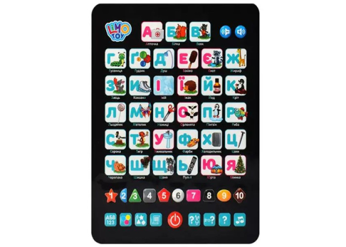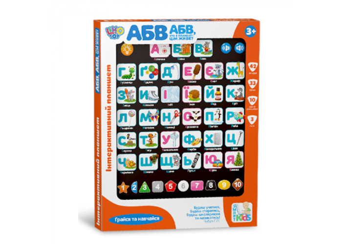 Швидко і легко впоратися з абеткою дитині допоможе інтерактивний планшет "Весела абетка" з ним заняття перетвориться в гру, а малюк навіть самостійно зможе запам'ятовувати літери. Планшет дуже схожий на справжній дорослий планшет. На ньому є регулятор гучності і вісім режимів: