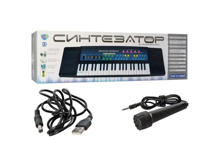 У комплекті мікрофон та USB (адаптер купується окремо) Розмір клавіш не відповідає реальним розмірам клавіш синтезатора чи фортепіано Іграшковий музичний інструмент Працює від мережі та від батарейок 6 шт. АА (у комплект не входять)