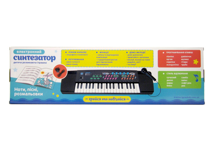Синтезатор - незамінна річ для юного музиканта! Якщо ваша малюк почав проявляти інтерес до музичних інструментів, потіште його багатофункціональним синтезатором «Орган» з мікрофоном. З його допомогою дитина зможе ознайомитися з базовими музичними поняттями, відтворювати відому музику і створювати власну. Це чудовий вибір для розвитку творчих задатків у дитини. Особливості: - вісім стилів відтворення, - плавне регулювання гучності і темпу звучання, - запис і відтворення, - програмування клавіш. Мелодії можуть відтворюватися в різних стилях. Є функція звукозапису. Орган працює як від батарейок, так і від мережі. У комплект входить: електронний синтезатор, мікрофон, адаптер для мережі, книжка з нотами, словами пісень і розмальовками, інструкція українською мовою. Така іграшка чудово урізноманітнює сімейне дозвілля, подарує масу позитивних емоцій, як дитині, так і всім учасникам. Характеристики: - Розмір: 66х19х6 см. - Матеріал: Пластик. - Колір: чорний. - Вік: 3 +. - Стать: унісекс. - Упаковка: картонна коробка.