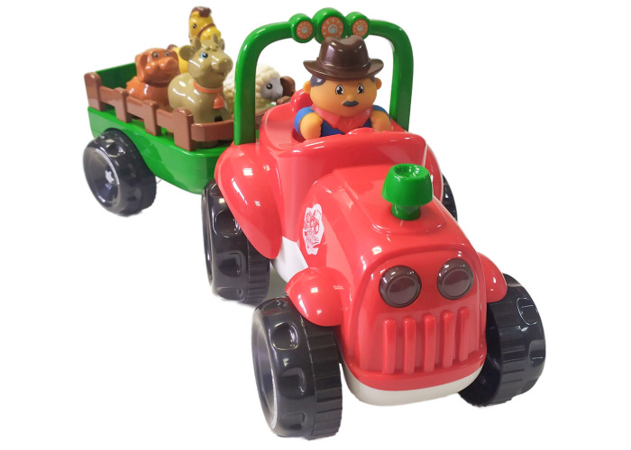 У причепі їде 4 фігурки тварин: кінь, вівця, корова і собачка. Трактор знає віршики про кожну з тварин, які їдуть в причепі. Іграшка вміє їздити як справжній трактор. Поїздка доповнюється звуковими ефектами і підсвічуванням фар, які додадуть іграшці реалістичності. Також, трактор вміє співати веселу пісеньку під час їзди.