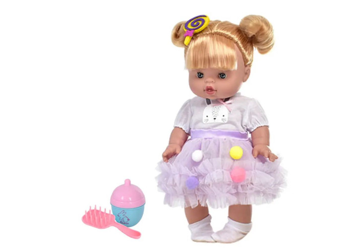У комплекті: - Лялька; - іграшка - пляшечка брязкальце; - гребінець;