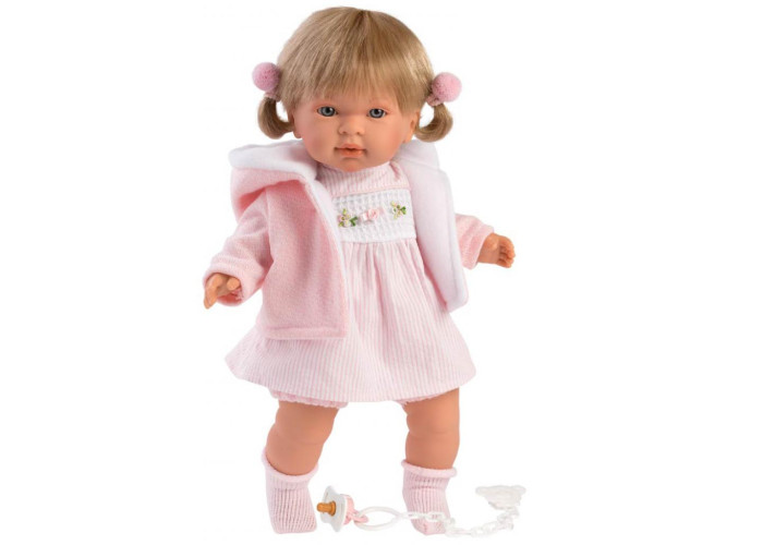 Оригінальна лялька Carla, від відомого іспанського бренду Llorens. Інтерактивна лялька Carla, що плаче, - втілення мрії кожної маленької дівчинки. Детальна промальовка пальчиків, красиві очі, рум'яні щічки та ніжна посмішка надають лялечці незвичайну реалістичність. Блискуче волосся прошите по всьому периметру голови, тому дитина зможе легко розчісувати свою маленьку подружку і робити їй красиві зачіски. Голова, ручки та ніжки виготовлені з приємного на дотик вінілу, а м'який животик - із щільного текстилю тілесного кольору. У комплекті з лялечкою є функціональна пустушка з тримачем, при вийманні якої вона плаче і каже "мама", "тато". Також велику увагу виробник приділив одягу, зробивши його із сертифікованого текстилю. При необхідності вбрання можна легко прати