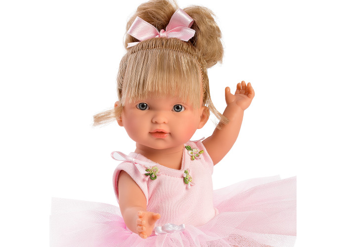 Лялька Valeria Ballet 28 см, новинка відомого іспанського бренду LLORENS. Valeria - лялечка балерина, з яскраво вираженими очима та пропорційним тілом, повністю зробленого з оксамитового, приємного на дотик вінілу. Всі частини тіла, лялечки, рухливі, завдяки чому вона може змінювати пози, а також самостійно стояти. Блискуче волосся прошите по всій голові, тому дитина зможе легко розчісувати свою маленьку подружку і міняти їй зачіски. Неперевершена маленька балерина одягнена у рожеву, прикрашену квітами сукню з фатиновою спідницею-пачкою. На ніжках ніжні рожеві пуанти зі стрічками.