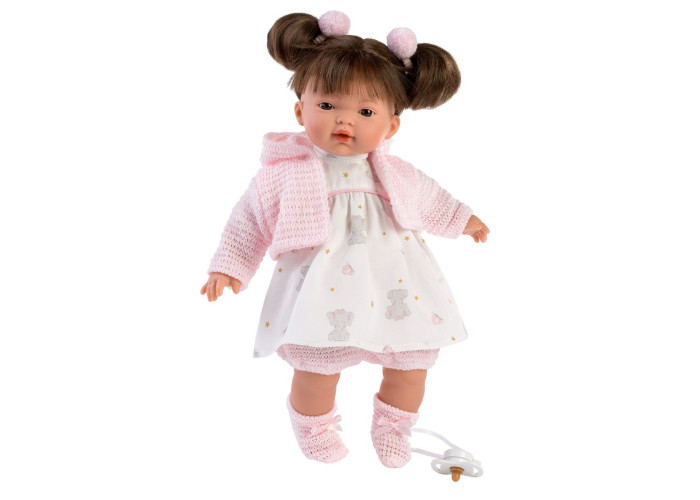 Оригінальна лялька Vera 33 см, відомого іспанського бренду Llorens. Інтерактивна лялька Vera, що плаче, - втілення мрії кожної маленької дівчинки. Детальна промальовка пальчиків, красиві очі, рум'яні щічки та ніжна посмішка надають лялечці незвичайну реалістичність. Блискуче волосся прошите по всьому периметру голови, тому дитина зможе легко розчісувати свою маленьку подружку і робити їй красиві зачіски, Голова, ручки та ніжки виготовлені з приємного на дотик вінілу, а м'який животик - із щільного текстилю тілесного кольору. У комплекті з лялечкою є функціональна пустушка з тримачем, при вийманні якої вона плаче і говорить "мама", "тато". Також велику увагу виробник приділив одязі, зробивши його із сертифікованого текстилю. При необхідності вбрання можна легко прати.