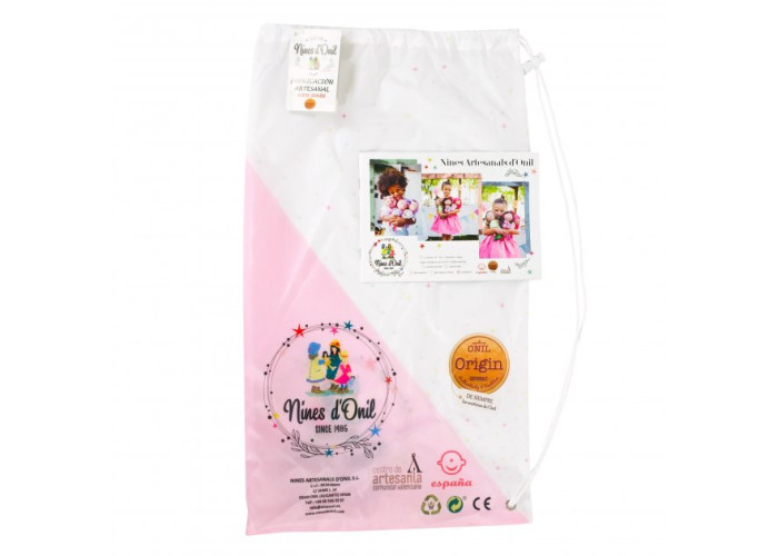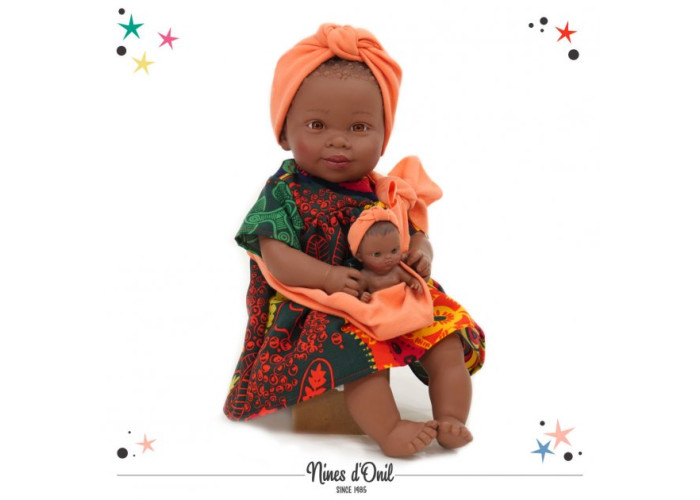 Іспанський бренд Nines D’Onil – одна з відомих у всьому світі лялькових фабрик. Чудові ігрові ляльки та пупси відрізняються високою якістю виготовлення, відмінною деталізацією та чудовим дизайном одягу та аксесуарів, виконаних вручну. Оригінальна лялька Марія, з малюком у слінгу, одягнена в стильну яскраву сукню в африканському стилі. Лялька виготовлена з комбінованих матеріалів: руки, ноги та голова вінілові, тулуб м'яконабивний. Детальна промальовування пальчиків, очей і вій, волосся, приголомшлива міміка надає ляльці незвичайну реалістичність. Марія та малюк виготовлені з нешкідливих матеріалів — бархатистого, приємного на дотик, вінілу та силікону, з легким ароматом ванілі. Всі частини тіла рухливі, очі не заплющуються. Без звукових ефектів. Лялька є 100% оригінальним товаром іспанської фабрики Nines D'Onil, має клеймо на потилиці, бирку на одязі. Запакована у стильний рюкзак.