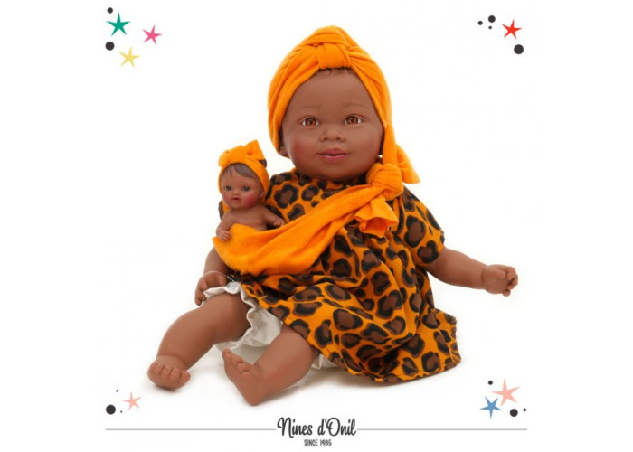 Іспанський бренд Nines D’Onil – одна з відомих у всьому світі лялькових фабрик. Чудові ігрові ляльки та пупси відрізняються високою якістю виготовлення, відмінною деталізацією та чудовим дизайном одягу та аксесуарів, виконаних вручну. Оригінальна лялька Марія, з малюком у слінгу, одягнена в стильну яскраву сукню в африканському стилі. Лялька виготовлена з комбінованих матеріалів: руки, ноги та голова вінілові, тулуб м'яконабивний. Детальне промальовування пальчиків, очей і вій, волосся, приголомшлива міміка надає ляльці незвичайну реалістичність. Марія та малюк виготовлені з нешкідливих матеріалів — оксамитового, приємного на дотик, вінілу та силікону, з легким ароматом ванілі. Усі частини тіла рухливі, очі не заплющуються. Без звукових ефектів. Лялька є 100% оригінальним товаром іспанської фабрики Nines D’Onil, має заводське тавро на потилиці, бірку на одязі. Упакована в стильний рюкзак.
