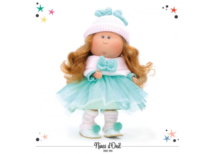 Новинкою від фабрики Nines d'Onil є оригінальна лялечка Мія з зворушливим виразом обличчя. Мія виготовлена з нешкідливих матеріалів — оксамитового, приємного на дотик, вінілу та силікону, з легким ароматом ванілі. Лялька може самостійно стояти, всі її частини тіла рухливі, очі не заплющуються, без звукових ефектів. Довге густе волосся прошите по всій голові. Завдяки цьому, лялечку можна легко розчісувати та міняти зачіски.