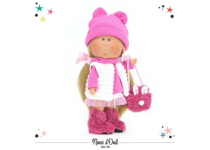 Новинкою від фабрики Nines d'Onil є оригінальна лялечка Мія з зворушливим виразом обличчя. Мія виготовлена з нешкідливих матеріалів — оксамитового, приємного на дотик, вінілу та силікону, з легким ароматом ванілі. Лялька може самостійно стояти, всі її частини тіла рухливі, очі не заплющуються, без звукових ефектів. Довге густе волосся прошите по всій голові. Завдяки цьому, лялечку можна легко розчісувати та міняти зачіски.