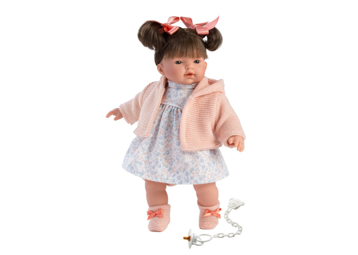 Лялька відомого іспанського бренду Llorens - це відмінна якість, безпечні гіпоалергенні матеріали, висока реалістичність і гарний одяг! Лялька Айтана - красива дівчинка з двома пишними хвостиками. Вона вміє кликати маму і тата і плакати, якщо забрати у неї соску. Тіло м'яке текстильне. Ручки, ніжки і голова зроблені з вінілу. Одягнена малятко в красиву сукню в квіточку, кофтус капюшоном і шкарпетки. Упакована в красиву подарункову упаковку.