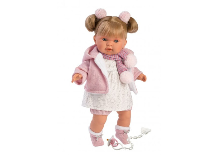 Інтерактивна лялька Alexandra, що плаче - втілення мрії кожної маленької дівчинки. Детальна промальовка пальчиків, красиві очі, рум'яні щічки та ніжна усмішка надають лялечці незвичайну реалістичність. Блискуче волосся прошите по всьому периметру голови, тому дитина зможе легко розчісувати свою маленьку подружку і робити їй красиві зачіски, Голова, ручки та ніжки виготовлені з приємного на дотик вінілу, а м'який животик - із щільного текстилю тілесного кольору. У комплекті з лялечкою є функціональна пустушка з утримувачем, при вийманні якої вона плаче і каже "мама", "тато". Також, велику увагу, виробник приділив одязі, зробивши його із сертифікованого текстилю. При необхідності наряд можна легко прати.