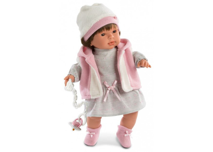 Представляємо красиву ляльку з останньої колекції іспанської мануфактури Llorens. Автентичні і ідеально відтворені форми ляльок і деталі особи, такі як очі, губи, волосся, напевно порадують кожну дівчинку! Carla висотою 42 см виготовлена з ніжного, приємного на дотик винила. Її м'який живіт наповнений підкладкою. Після зняття соски лялька буде плакати і говорити «мама, тато». У Карли карі очі і напівдовге волосся з чубчиком. Вона одягнена в прекрасну сіру сукню і рожево-білу жилетку. У комплект також входять шапка з плюшу і чарівні шкарпетки. Лялька упакована в елегантну картонну коробку, що ідеально підходить для подарунка.