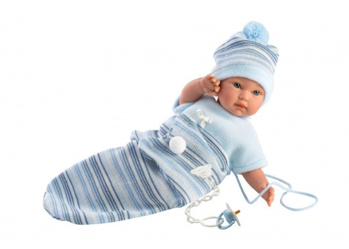 Пупс Llorens має оригінальний дизайн. Губки, щічки, вічка, вії - все зроблено з неймовірною уважністю до деталей. Голова, ручки і ніжки - рухаються. Лялька виготовлена з екологічно чистого вінілу і м'яконабивного тіла. Пупс одягнений в м'який блакитний комбінезон, на голові шапочка з помпоном. Лялька інтерактивна. Якщо натиснути ляльці на животик, лялька буде плакати, казати мама і тато. У комплект входить слінг у вигляді сумки, в якому ми можемо носити ляльку з собою всюди. Соска, прикріплена до ляльки, має декоративну функцію. Лялька упакована в декоративну картонну коробку.
