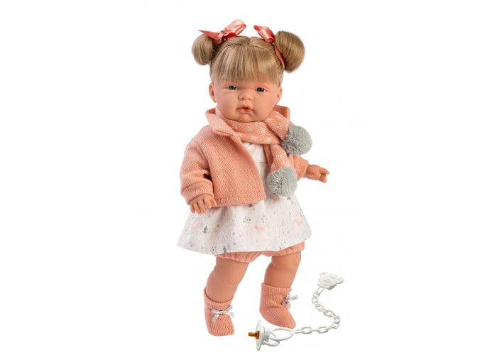 Лялька відомого іспанського бренду Llorens - це відмінна якість, безпечні гіпоалергенні матеріали, висока реалістичність і гарний одяг! Лялька Джоель Llorens - чарівна дівчинка з рудим волоссям, одягнена в сукню і теплу кофту. У ляльки мягконабивне тіло, виконане з ПВХ з наповнювачем з синтетичного волокна. Ручки, ніжки і личко з вінілу. Гра з лялькою прищеплює дитині почуття турботи, відповідальності. Лялька має високу реалістичністю, у неї присутні характерні складочки на руках, ногах, шиї і самому тілі. У комплекті з лялькою поставляється соска на ланцюжку з прищіпкою. Якщо витягнути соску з рота, вона починає плакати і говорити мама і тато. Підходить для дітей старше 3-х років. Лялька упакована у фірмову коробку.