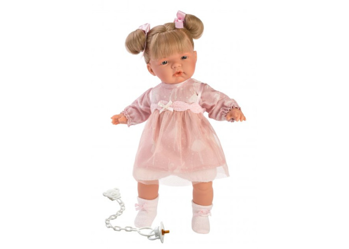 Лялька відомого іспанського бренду Llorens - це відмінна якість, безпечні гіпоалергенні матеріали, висока реалістичність і гарний одяг! Лялька Джоель має миловидний личок, одягнена в акуратне плаття в квіточку і жакетик, на ніжках носки з помпонами. Волосся ляльки прошите, зібране у два хвостики. Лялька вміє плакати і звати батьків (мама. тато), якщо в неї забрати пустушку. Підходить для дітей віком від 3 років. Лялька упакована у фірмову коробку.