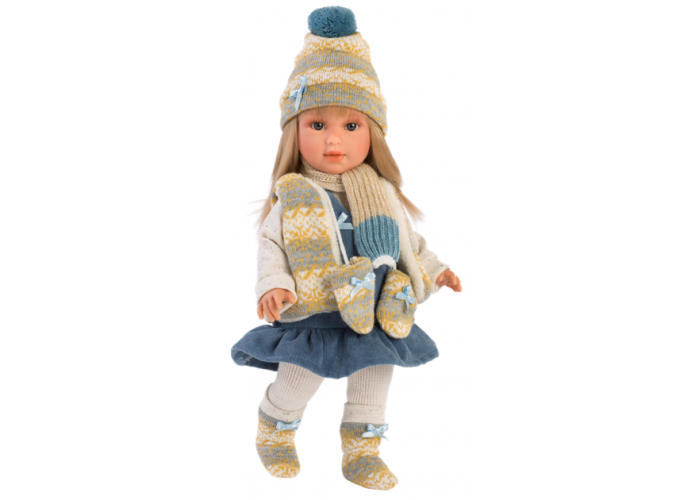 У красуні Тіни миле личко і виразні очі з шикарними віями. Лялька одягнена в біле плаття синього кольору, желеточку і колготи. На її ніжках красуються теплі черевички з бантиками, а ручки гріють рукавиці.