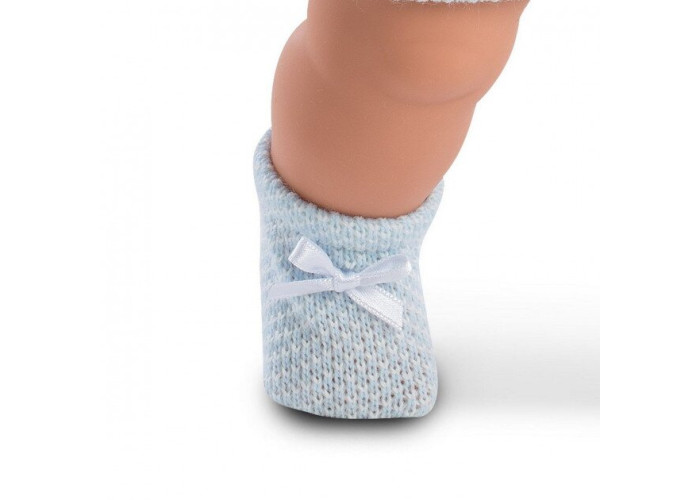 Представляємо красиву ляльку з останньої колекції іспанської мануфактури Llorens. Автентичні і ідеально відтворені форми ляльок і деталі особи, такі як очі, губи, волосся, напевно порадують кожну маленьку і велику дівчину! Мігель висотою 42 см виконаний з ніжного, приємного на дотик винила. Його м'який живіт наповнений підкладкою. Після зняття соски лялька буде плакати і говорити «мама, тато». У Мігеля блакитні очі, які постійно відкриті. Він одягнений в блакитний комбінезон і блакитну кофтинку з капюшоном. У комплект також входять шапочка і шарфик з помпонами, шкарпетки. Лялька упакована в елегантну картонну коробку, що ідеально підходить для подарунка.