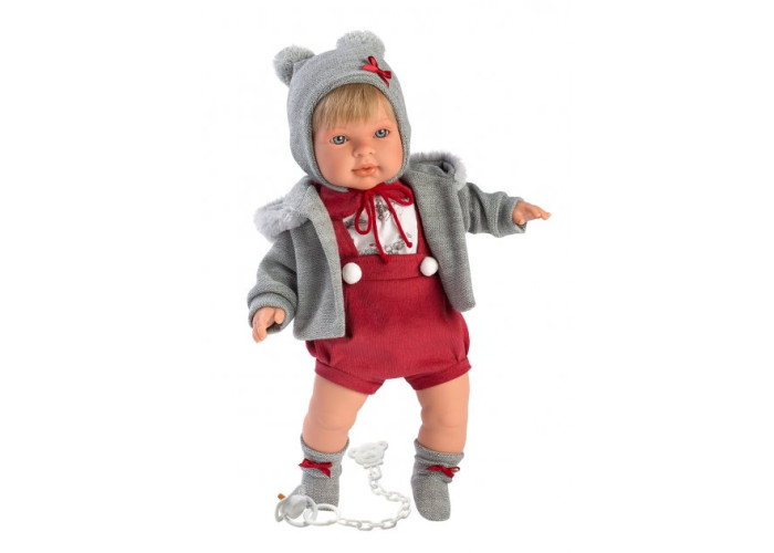 Пупс хлопчик має реалістичний вигляд, а також має звукові ефекти. Він плаче і каже мама/тато. Вид ляльки наближений до виду справжньої новонародженої дитини. Голова, ручки та ніжки зроблені з гвинла. Тіло – м'яконабивне. Світле волосся прошите по всій голові. Малюк одягнений у характерний бордовий комбінезон, сіру кофтинку, шапочку та шкарпетки. На ніжках шкарпетки. Доповнюють наряд шапочка та шарфик у тон. Підходить для дітей старше 3-х років. Лялька упакована у фірмову коробку.