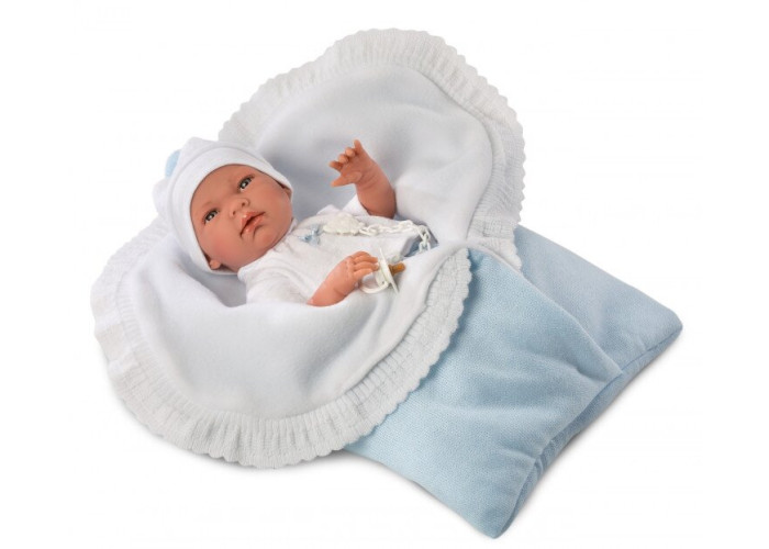 Немовля Ніко - 38 см і виконаний повністю з тонкого, приємного на дотик винила. Ручки і ноги рухливі, ляльку можна купати! Прикріплена соска виконує декоративну функцію. Ніко одягнений в білу блузку, короткі штанці і прекрасну шапочку з синім помпоном. Набір поставляється з двостороннім біло-рожевим конусом з обробкою. Лялька упакована в елегантну коробку, що ідеально підходить для подарунка.