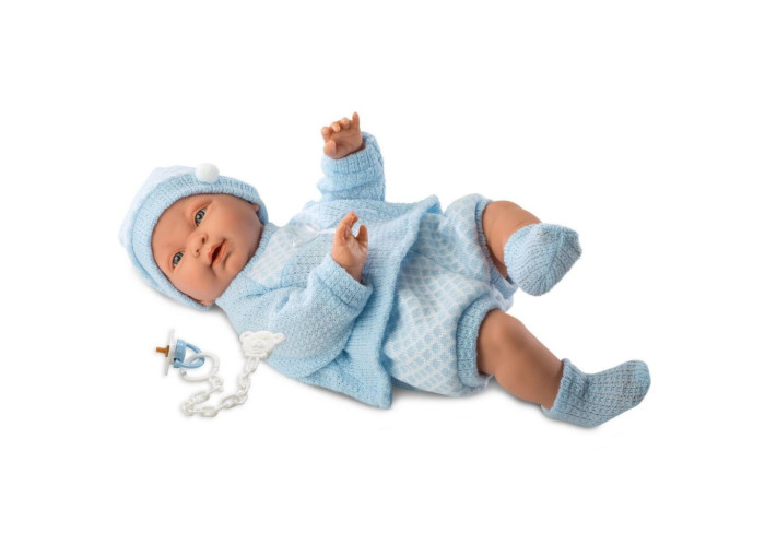 Ляльки з останньої колекції іспанського мануфактури Llorens виглядають як справжня дитина і є ідеальною іграшкою для дітей будь-якого віку. Виробник подбав про деталі натуралістичного зовнішнього вигляду, таких як стать, складки і виразу обличчя, що робить цих ляльок схожими на справжню дитину. Немовля хлопчик висотою 45 см виконаний виключно з тонкого, виключно м'якого і приємного на дотик винила. Ляльку можна купати! Ручки і ноги рухливі. Він одягнений в трикотажний синій светр і шорти. У комплект також входить мила шапочка з помпоном і шкарпетки. Лялька упакована в елегантну коробку, що ідеально підходить для подарунка.