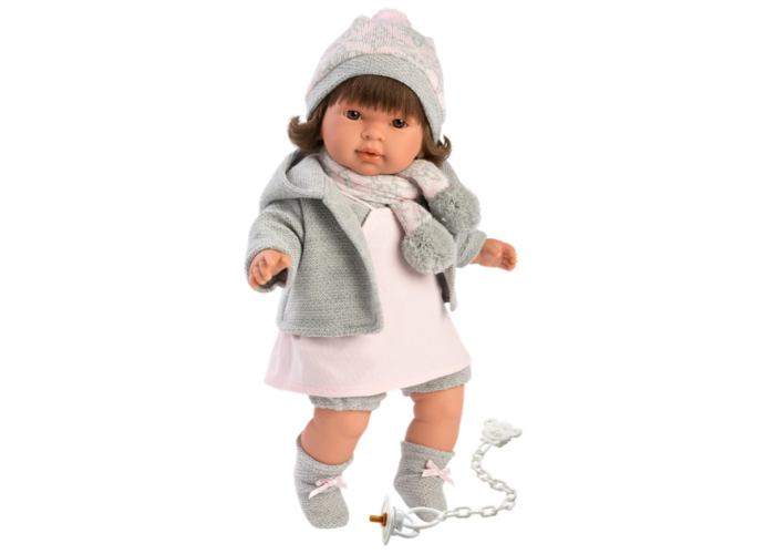 Лялька Піпа Llorens - виготовлені з високоякісних матеріалів. Вона має мягконабивне тіло, а ніжки і ручки зроблені з м'якого вінілу. Лялька буде плакати, коли ми натиснемо на її м'який животик. У малятка світлі очі, які не зачиняються. Одягнена Піпа в рожеве платьеце, кофточку, шарфик і шапочку з помпоном. На нажках сіренькі носочки з бантиками. Також є пустушка.